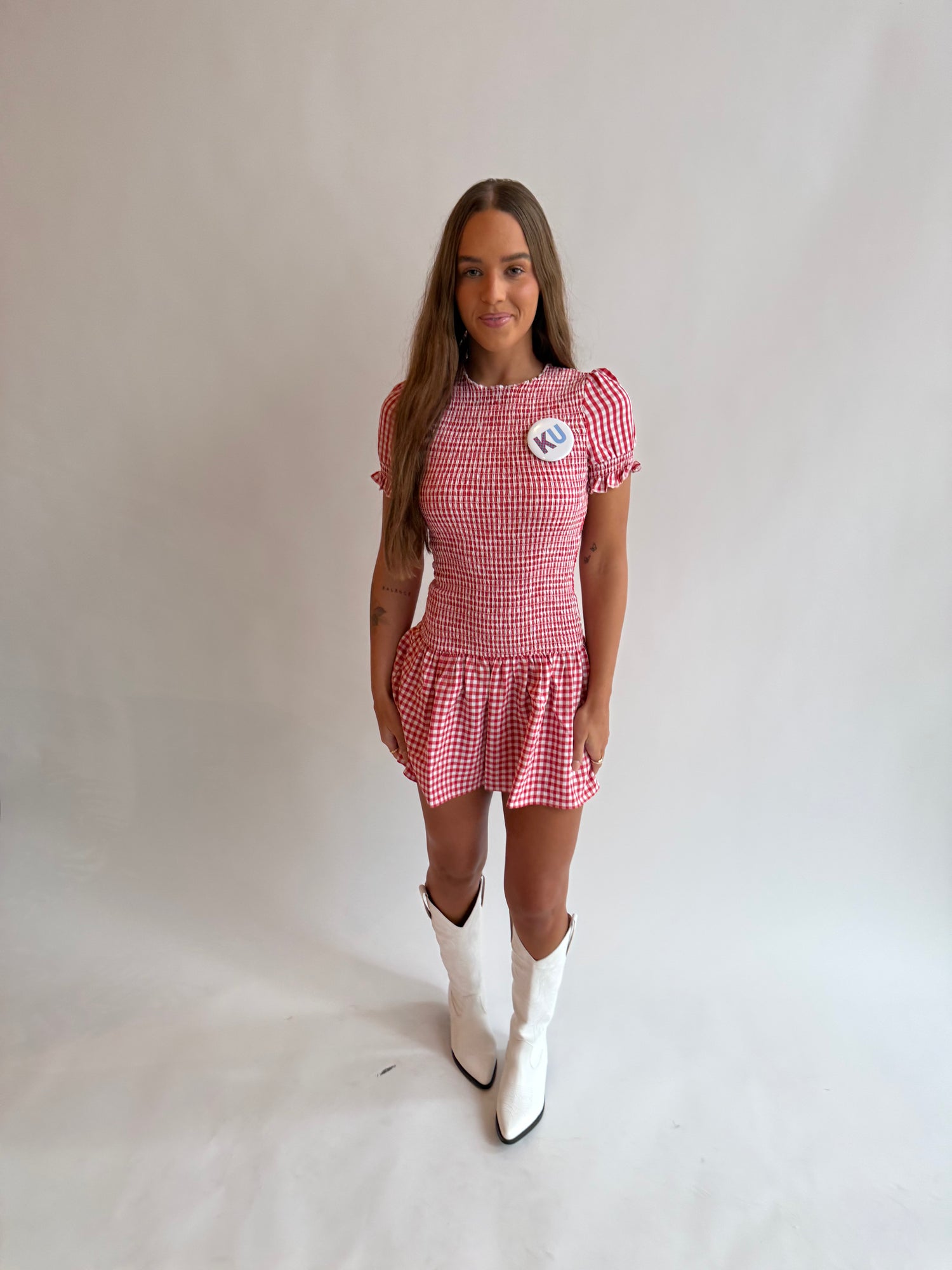 Step out in style with the Best Dressed Smock Dress in vibrant red gingham. This playful mini flare dress features charming smocked detailing that adds a fun, flirty touch perfect for game day or any sunny outing. Lightweight and breezy, it keeps you comfortable while turning heads wherever you go.